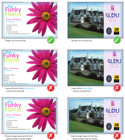 As the bleed and quite zone are really important to the design and printing of your product we will explain a little more on the importance of the correct bleed and quiet zone, here are some common examples of the right and wrong way to do it: