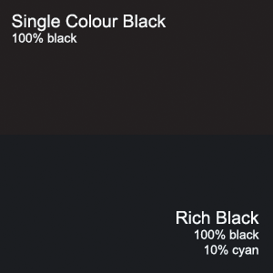 - Rich black which contains 100% black and 10% cyan and better for larger areas to ensure an even, dark coverage because any inconsistencies will be disguised by the second colour.